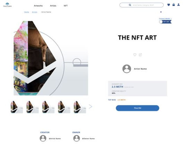 The latest integration of the NFT transaction system enables real-time transaction of NFT Art by cryptocurrency(Ethereum) In order to make the transaction between Users and Artists smooth, the platform integrated a linkage function with Ethereum Wallet and purchase functions which enable users to buy digital art created by 100 digital artists out of 2,400 artists in TRiCERA network. Also, TRiCERA is now compatible with formats other than image data such as movie file format to enable diverse ways of digital art transaction.