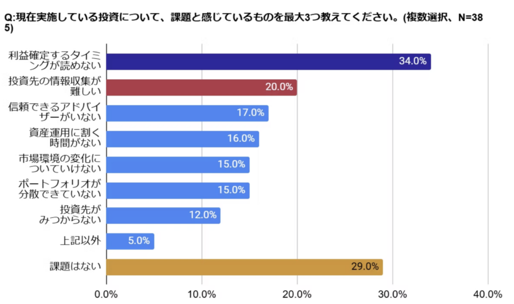 「利益確定するタイミングが読めない」がトップとなったが、一方で3割が課題はないと回答。
